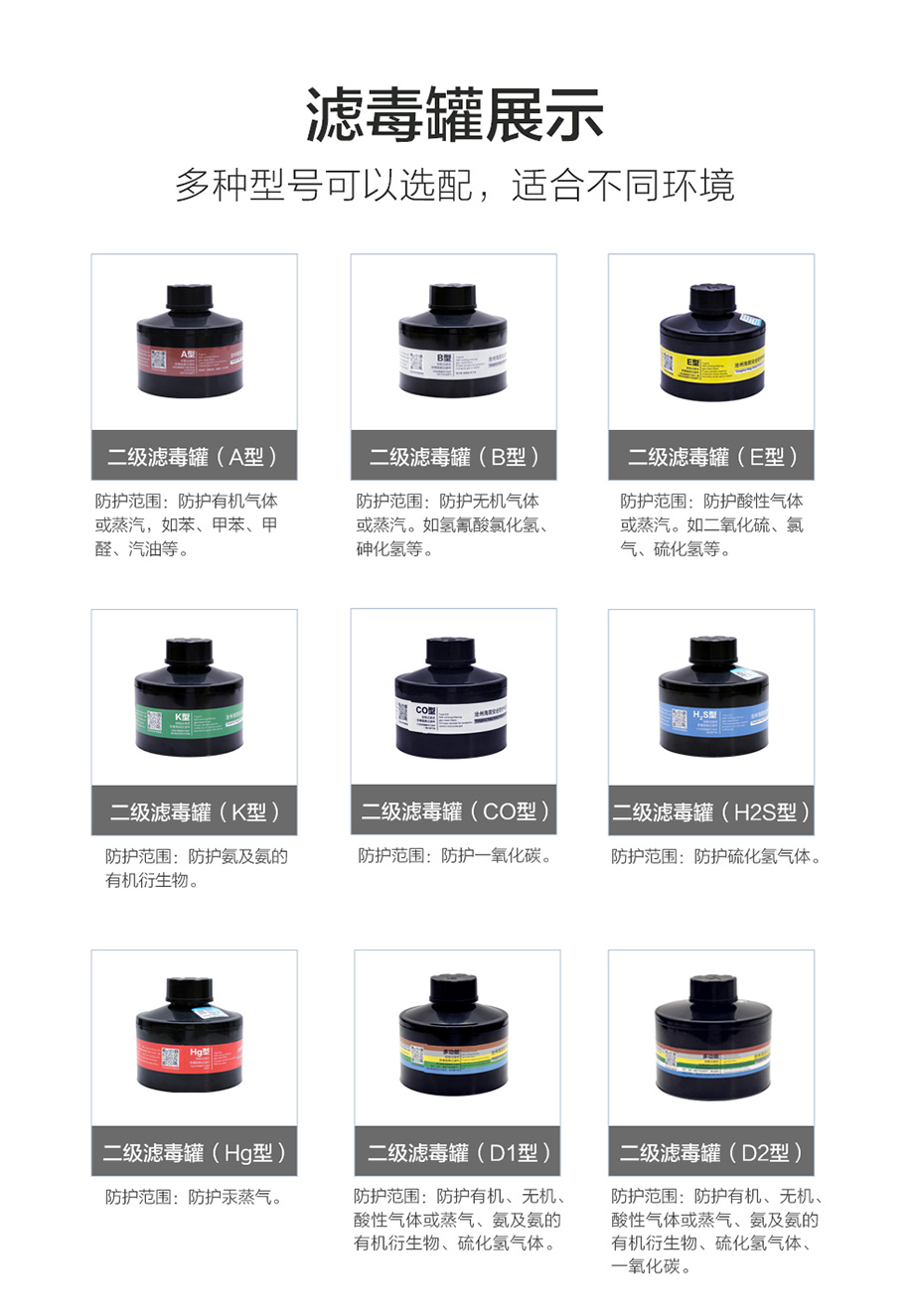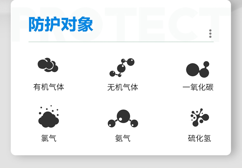 防護(hù)范圍:主要防護(hù)有機(jī)、無(wú)機(jī)、酸性氣體或蒸汽、氨及氨的有機(jī)衍生物、一氧化碳、硫化氫氣體