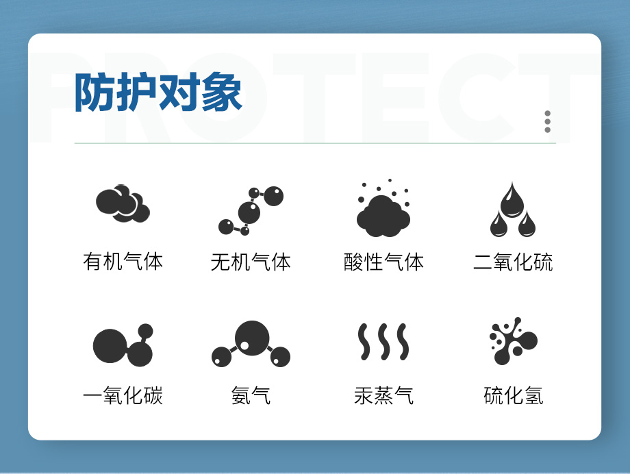 防護(hù)范圍:主要防護(hù)有機(jī)、無(wú)機(jī)、酸性氣體或蒸汽、氨及氨的有機(jī)衍生物、硫化氫氣體、汞蒸氣、一氧化碳?xì)怏w